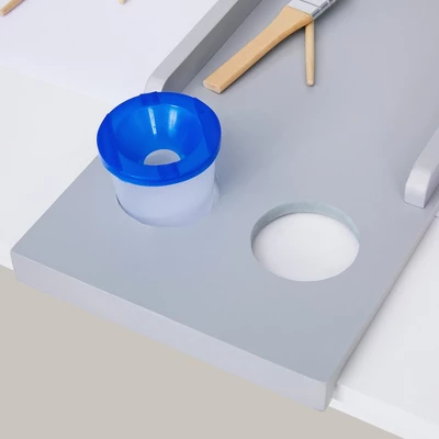 - ART TRAY: The removable tray can be securely placed anywhere on the table to help hold paper in place and features four cup holders for paint. The lip of the tray keeps colored pencils and paintbrushes from rolling away.