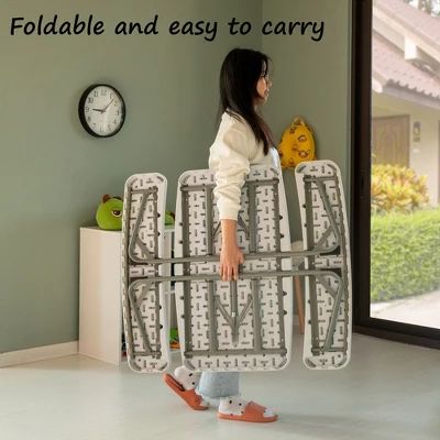 This foldable white children’s picnic table is the perfect outdoor solution for your kids’ crafting, dining, and playtime needs! It’s made with a durable plastic tabletop and seats, and a sturdy metal frame, with a weight capacity of 330 lbs and seating for 4 kids. The plastic material is easy to clean and maintain, making it a practical choice for outdoor activities that involve spills, stains, and messes. The foldable design allows for easy storage and transport, making it a convenient option for families who love to spend time outdoors. Whether you’re planning a picnic, a backyard BBQ, or a day at the park, this foldable white children’s picnic table is the perfect addition to your outdoor gear. This picnic table is designed to provide a comfortable and safe space for your children to enjoy various outdoor activities, from snacking and crafting to playing games and socializing with friends. The sleek white finish adds a touch of style and sophistication to any outdoor setting, making it a perfect fit for your backyard, patio, or garden. Overall, this picnic table is a practical, functional, and durable outdoor furniture piece that encourages your children to stay active and creative.