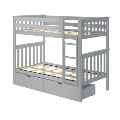 Plenty of room for sleep and play? Now that’s a win-win! The Max & Lily Twin Over Twin Bunk Bed with Under Bed Storage Drawers is the perfect combination of functional and fun that both kids and parents love. Top bunk features tall 14” guardrails, so the bed safely fits standard mattress sizes. Added under bed storage drawers make organizing a breeze. Angled ladder with rounded edges offers comfortable, easy climbing. Added bonus – ladder is both reversible and removable, so it is flexible to work with any space. Solid, knot-free New Zealand pine wood adds strength and stability. All Max & Lily products use a durable, low VOC finish. The slatted head and footboards and flush, color-matched hardware give this bunk bed a clean, modern look. Instructions, upper/lower slat rolls, and required hardware are included. With solid plywood slats and a metal support bar for the top bunk, each sleeping surface can support 400 pounds of resting weight. This bed meets or exceeds Federal safety standards for kids furniture. When it’s time for play, this bunk bed’s space saving design frees up plenty of floor space by stacking two sleeping surfaces. 2+ adults make assembly simple and easy. The Twin Over Twin Bunk Bed with Under Bed Storage Drawers from Max & Lily offers exceptional quality and affordability that kids and their parents will enjoy for years to come. Max & Lily is a member of the Maxwood family of brands – the kids furniture experts bringing a tradition of superior quality, safety and fun!